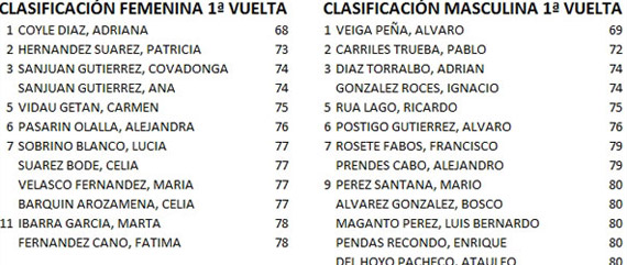 El jugador de La Coruña Álvaro Veiga —finalista Lacoste Promesas 09 y ganador del primer Puntuable Zonal Juvenil Galicia-Asturias 2010— ha sido el único de los chicos que ha logrado ganarle al campo, entregando una primera tarjeta de 69 golpes —menos 3—, para situarse el primero con tres de ventaja sobre el asturiano Pablo Carriles, de Llanes, segundo con el par del campo. En tercera posición, con 74, han empatado el cántabro Adrián Díaz —de La Junquera— e Ignacio González Roces.