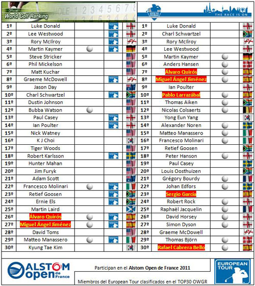 Los italianos Francesco (22º) y Edoardo Molinari (35º, The Barclays Scottish Open de 2010) y Matteo Manassero (29º, Maybank Malaysian Open de 2011), y los nórdicos Anders Hansen (43º) y Peter Hanson (41º, Czech Open de 2010), completan, junto al guadiareño Álvaro Quirós (26º, Omega Dubai Desert Classic de 2011) la nómina de nueve integrantes del top 50 del ránking mundial presentes en el Alstom Open de France, lo que permitirá que el ganador se lleve una cifra superior a los cuarenta puntos del OWGR, además de un primer premio de medio millón de euros.