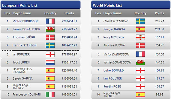 Victor Dubuisson, Jamie Donaldson, Thomas Björn y Henrik Stenson ocupan por el momento las cuatro plazas de privilegio con un colchón que debería ser suficiente en el caso de los dos primeros (en 2012 Graeme McDowell consolidaba la cuarta plaza con 2.375.790 puntos, apenas 200.000 superior a la cifra amasada por el galés de una regularidad a prueba de bombas) pero que exigirá un último esfuerzo para la dupla nórdica, que aún sobrevive gracias a la renta de un soberbio final de temporada, en el caso del sueco, y la aventura millonaria de Sun City, en el caso del danés, respectivamente.