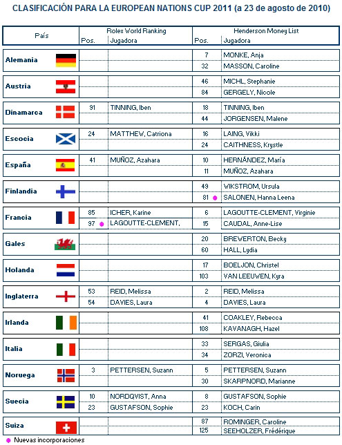 Aunque la clasificación para la European Nations Cup no parece haber sufrido demasiadas variaciones a raíz de los torneos disputados la semana pasada en el Ladies European Tour y el LPGA Tour, un examen un poco más concienzudo nos permite destacar el gran paso que ha dado Virginie Lagoutte-Clement para asegurarse una plaza en el torneo que volverá el año que viene a La Sella Golf Resort en su cuarta edición.