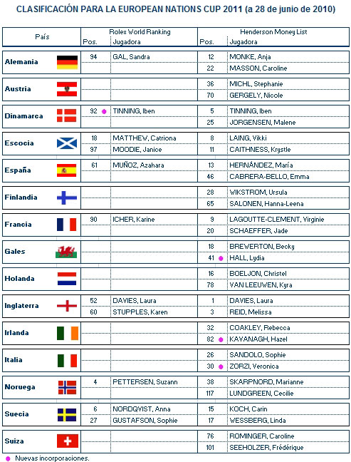 En una semana de escaso movimiento, la incorporación de la danesa Iben Tinning al top 100 del ránking mundial y el ascenso imparable de la española Azahara Muñoz son las novedades más destacadas en la clasificación provisional para la Comunitat Valenciana European Nations Cup 2011, el joven pero ya asentado torneo que se ha convertido en una cita ineludible del Ladies European Tour y que volverá el año que viene a La Sella Golf Resort.