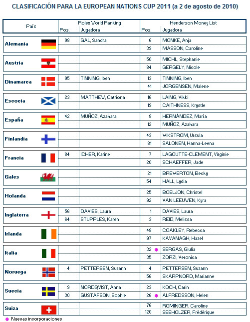 La glamurosa jugadora rusa Maria Verchenova, en la cuerda floja desde hace unos meses en el Ladies European Tour, vuelve a perder su puesto en el top 100 de la lista de ganancias y este descenso lleva aparejada la desaparición de Rusia de los equipos con derecho a una plaza en la Copa de Europa de Naciones. Por otro lado, al equipo italiano se incorpora Giulia Sergas gracias a su avance en el ránking europeo fruto de sus buenas actuaciones en el Evian y el British Femenino, y sale de la squadra azzurra la fotogénica Sophie Sandolo.