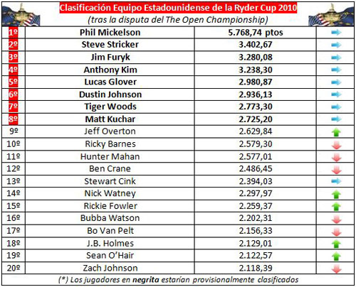 En el equipo estadounidense de la Ryder Cup no se han producido cambios en su composición provisional, dado los discretos registros de sus principales figuras, situación que ha aprovechado la joven hornada de nuevos valores norteamericanos para escalar posiciones.