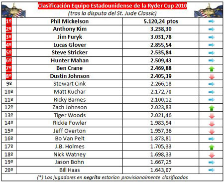 Pese a todo, Ben Crane y Zach Johnson sí consiguen traducir positivamente su decimosegunda posición en el Abierto de Memphis. Así, el primero asciende hasta el séptimo lugar de la clasificación para el equipo estadounidense de la Ryder Cup, relegando a la octava posición a un Dustin Johnson al que se acerca el ganador del Masters de Augusta de 2007 tras superar la marca de los dos mil puntos.