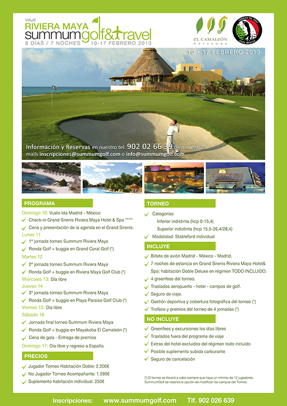 Como no resulta nada sencillo organizar un viaje con el golf como protagonista, desde Summum plantean varias propuestas durante los próximos meses para aquellos jugadores que quieran ver cómo se vive este deporte más allá de nuestras fronteras. La primera de ellas es en la Riviera Maya, del 17 al 24 de febrero. Esta escapada en San Valentín se prolonga a lo largo de siete noches en un hotel de cinco estrellas, el Grand Sirenis Riviera Maya Hotel & Spa, en un régimen todo incluido y con un aliciente muy importante para los golfistas: un Torneo Summum de cuatro rondas en los recorridos de Grand Coral, Riviera Maya Golf Club, Iberostar y El Camaleón Mayakoba, diseño de Greg Norman, en el que se disputará una gran final el sábado 16.