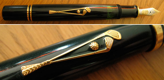 Otra edición limitada es la que hizo Pelikan en 1996 tomando como base su modelo Souverän M800. Es una pluma de celuloide verde oscuro en cuyo cuerpo van encastrados dos palos y una bola de golf en plata vermeil.