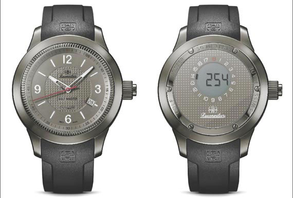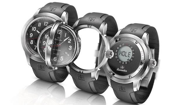 A simple vista es un sencillo reloj de 44 mm, con tres agujas y fechadora a las 4, que monta un calibre ETA 2892A2 y cuya única relación con el golf es el texturizado de la esfera en forma de hoyuelos. Las sorpresas comienzan cuando se activa el mecanismo de rotación de la esfera para poner al descubierto que la trasera es una segunda esfera digital que, además de la hora, muestra la distancia a green medida por GPS.