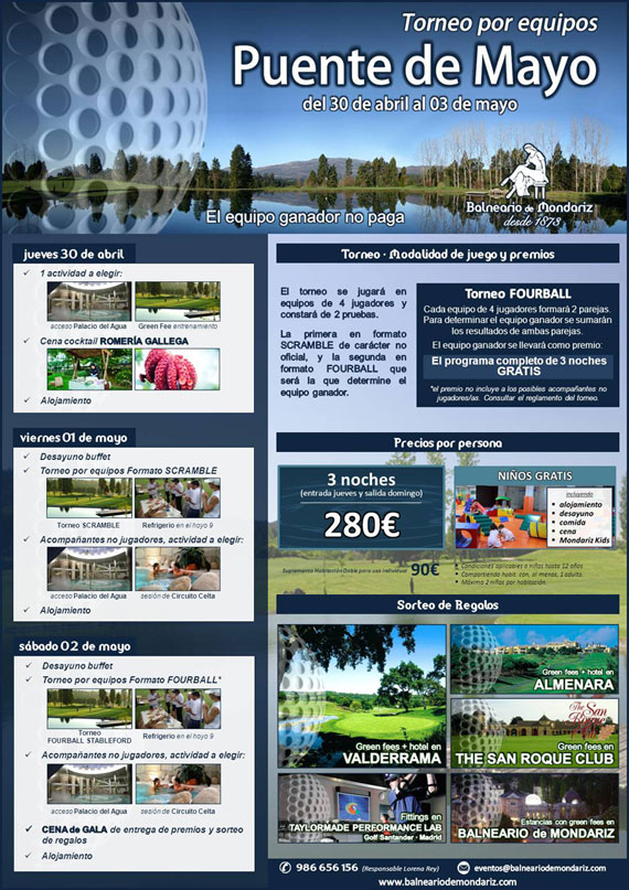 El buen tiempo empieza a ofrecer un oportunidades golfísticas y turísticas, y el Puente de Mayo se convierte en el primer objetivo para aquellos que tengan ganas de disfrutar de estas dos opciones de ocio. Para estas fechas, Balneario de Mondariz propone un atractivo torneo por equipos a un precio increíble.