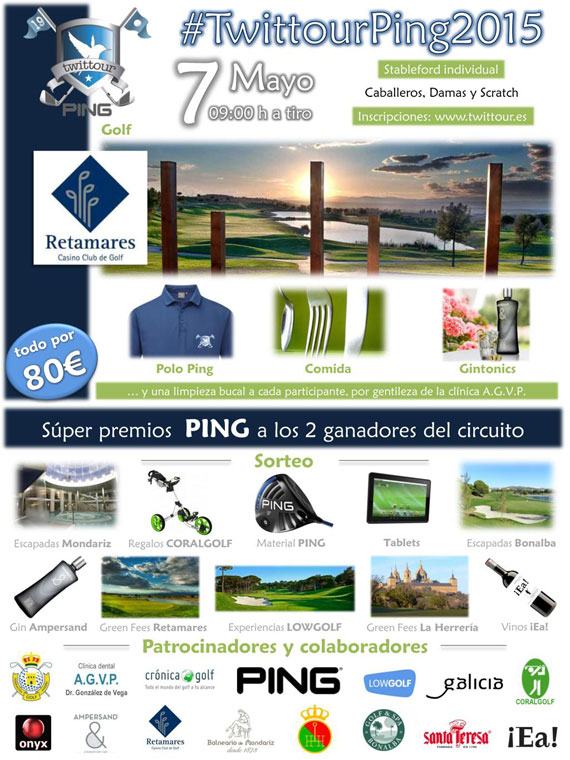 Este año el circuito se compone de cuatro pruebas: dos en Madrid a un día de competición. en Retamares y La Herrería, y dos en fin de semana a dos días de competición. en el Balneario de Mondariz, un clásico ineludible en el calendario del Twittour, y en Bonalba. El Twittour Ping 2015 se estrenará el jueves 7 de mayo en Retamares Casino Club de Golf, espectacular diseño de José María Olazábal en el municipio madrileño de Alalpardo, en una jornada plena de actividades. Por solo 80 €, los jugadores participarán en el torneo, recibirán un polo Ping, disfrutarán de una comida con el resto de los participantes y de una degustación de gin-tonics por cortesía de Ampersand Gin. Además, la Clínica A. G. V. P. tiene la cortesía de ofrecer una limpieza bucal a todos los participantes. La salida será a tiro a las 9 de la mañana y durante la comida habrá un gran sorteo de regalos.