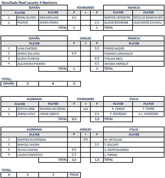 Francia ha derrotado a España en la final del trofeo Lacoste 4 Naciones, disputado en el recorrido gerundense de Peralada Resort, por 4 – 2 en el marcador. El combinado de Alemania supera al de Italia en play-off tras finalizar ambos equipos empatados con 3 puntos cada uno.