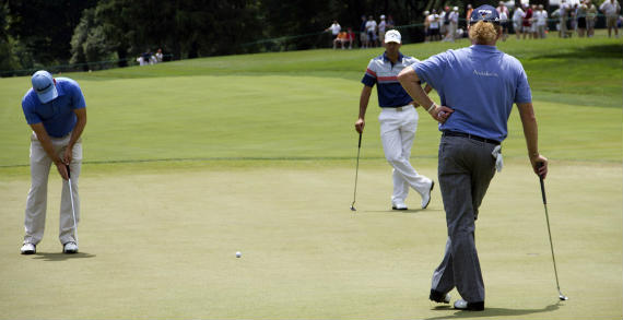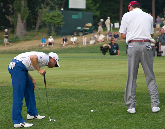 • Aunque ya se ha hablado largo y tendido del asunto, este año la USGA nos ha regalado un buen número de partidos “temáticos”. Teníamos agrupados a los tres primeros del mundo (Donald, Westwood y Kaymer), había un partido de estrellas de origen oriental (Ishikawa, Kim y Yang) y, además de los inevitables grupos 100% estadounidense, disfrutamos de tres tríos mononacionales: el italiano (con los hermanos Molinari y Matteo Manassero), el sueco (con Stenson, Edfors y Jacobson) y el español (reflejado en la foto).