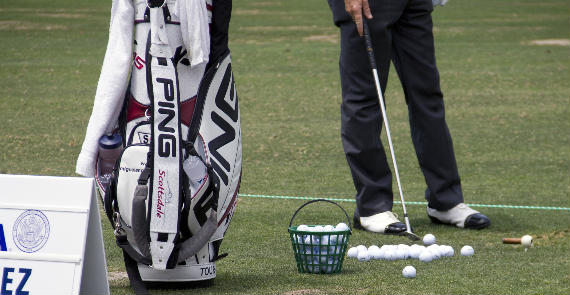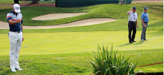 • Sergio observa con atención cómo la bola de Kuchar se mantiene en equilibrio inestable junto al obstáculo de agua del 18 en la última jornada, después de que el estadounidense se viera obligado a colocar la bola (que no se sostenía tras el dropaje). Ese equilibrio inestable de la bola de Kuchar es una oportuna metáfora para la situación actual del golf estadounidense.