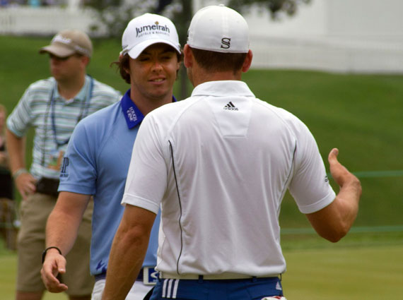 • Y a modo de colofón, no podíamos dejar esta maravillosa instantánea en la que Sergio García se dispone a felicitar a Rory McIlroy en las inmediaciones del hoyo 18. Esperemos que en breve se repita esa misma foto pero con los papeles invertidos.