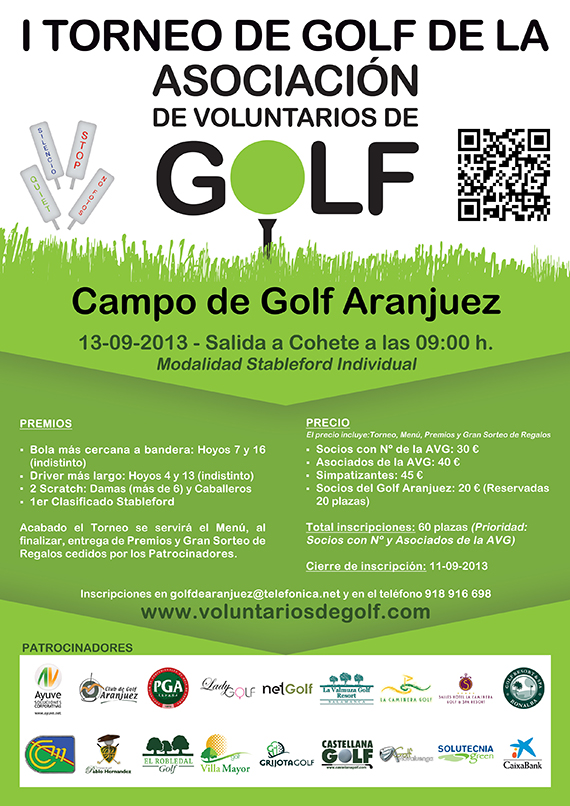 La Asociación de Voluntarios de Golf (AVG) celebrará su primer torneo en el Campo de Golf de Aranjuez el próximo 13 de septiembre. La modalidad elegida es Stableford Individual, y contará con una gran variedad de premios, así como de una comida en el mismo club.