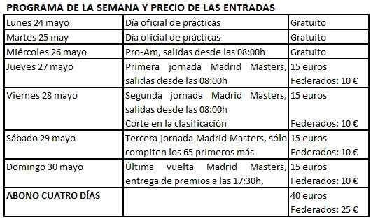 El comité organizador del Madrid Masters de Golf, prueba valedera para el Circuito Europeo que tendrá lugar la próxima semana en la RSHECC —Real Sociedad Hípica Española Club de Campo—, ha decidido facilitar a los aficionados la posibilidad de adquirir las entradas a precios muy asequibles y con importantes descuentos.
