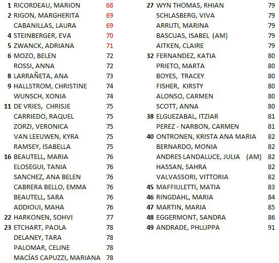 La austriaca Eva Steimberg es cuarta con menos 2; la madrileña Adriana Zwanck se ha situado en quinto lugar con 1 bajo par; la gaditana Belén Mozo y la italiana Anna Rossi comparten la sexta posición con el par del campo; y la navarra Ana Larrañeta, vigente campeona de España, es octava con más 1.