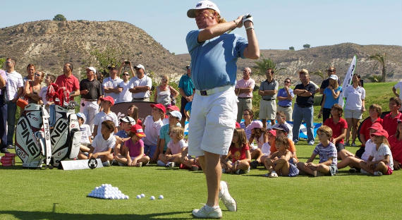 El prestigioso jugador de golf Miguel Ángel Jiménez inauguró el pasado sábado en las instalaciones del alicantino Font del Llop Golf Resort la escuela de golf que lleva su nombre. Con ese motivo, impartió la clase inaugural a un grupo de 60 niños que acudieron al campo de Monforte del Cid.