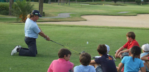 Miguel Ángel Jiménez dejó maravillados a grandes y pequeños en la clase magistral de golf que impartió en la tarde del martes, magnífico preámbulo del Challenge Juvenil que comenzó ayer miércoles en las instalaciones de Mar Menor Golf. Durante casi dos horas, el campeón malagueño de golf ofreció un auténtico recital que divirtió a todos los asistentes que acudieron al recorrido murciano.