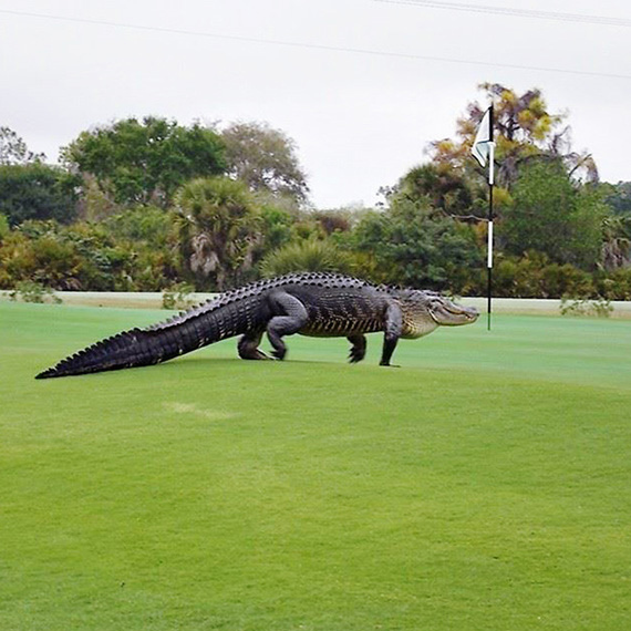 El campo en cuestión es un recorrido ubicado en los Everglades, la zona pantanosa de Florida que es hábitat natural de caimanes, y el viernes pasado uno de los socios del Myakka Pines Golf Course puso en la página de facebook del club una foto hecha mientras jugaba en la que se podía ver un caimán tremendo. Las visitas se dispararon y las reservas de fees para intentar ver al imponente animal de cuatro metros también. Sin embargo, y según palabras de su director Mickie Zada, no es el más grande que han visto por allí, pues había uno llamado «Big George» que llegaba a los cinco metros. Aquí les dejamos la foto en cuestión y esperamos que si se convierte en moda en España tomen algún otro animal menos peligroso como mascota.