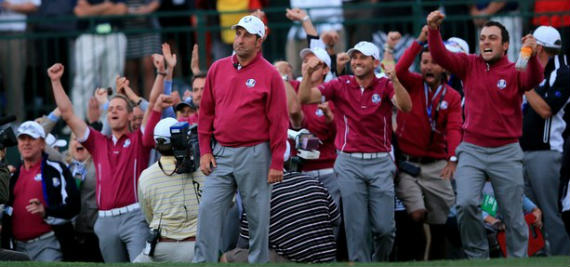 Ben Crenshaw Brandt Snedeker Brookline Bubba Watson Davis Love III Francesco Molinari Graeme McDowell Ian Poulter Jason Dufner Jim Furyk José María Olazábal Justin Leonard Justin Rose Keegan Bradley Lee Westwood Luke Donald Martin Kaymer Matt Kuchar Medinah Country Club Nicolas Colsaerts Paul Lawrie Peter Hanson Phil Mickelson Rory McIlroy Ryder Cup Ryder Cup 2012 Sergio García Steve Stricker Tiger Woods Webb Simpson Zach Johnson