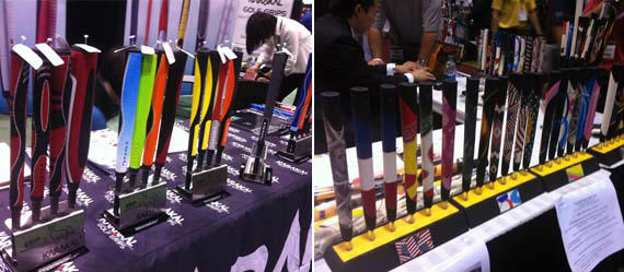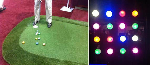 Seguimos con material perfecto para aquellos a quienes les gusta llamar la atención en los campos de golf. Ultimamente se está poniendo de moda jugar con bolas de colores, sobre todo amarillas (véase el ejemplo de las Srixon Z Star o de las Titleist NXT), pero la marca estadounidense ChromaxGolf va más allá y ofrece un amplio abanico de posibilidades a cuál más estridente: bolas doradas, plateadas, cobrizas… Reconozco que en principio pensé que eran adornos de navidad. Al lado encontré el stand de Night Flyer, otro fabricante de bolas, en este caso luminosas e ideales para el golf nocturno. Pese a lo que parezca, no son bombillas.