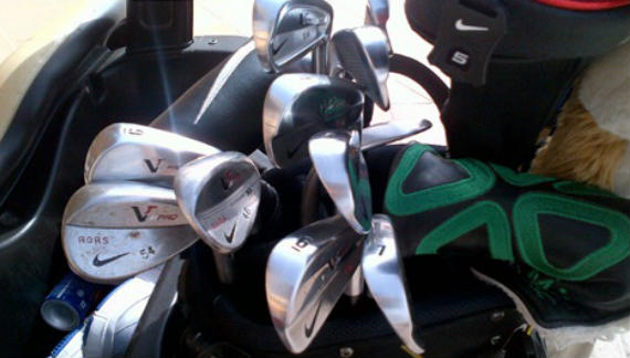 En la bolsa se pueden ver 15 palos, incluyendo dos putters (su habitual Scotty Cameron y un nuevo modelo de Nike Method). Por la foto no podemos ver qué varillas uso, aunque suponemos que seguirá con las mismas que llevaba en sus Titleist. El material al completo podría ser el siguiente: Nike Covert Driver, hierros VR II Pro y wedges de 46, 50 y 54 grados, grabados con su nombre (“Rors”) en la cabeza.