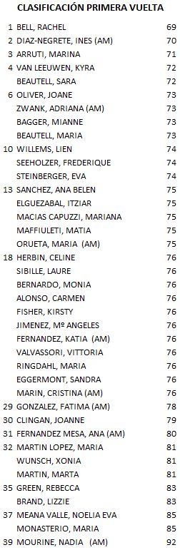 En cuarta posición han empatado la tinerfeña Sara Beautell y la holandesa Kyra Van Leeuwen con el par del campo, y el sexto puesto lo comparten María Beautell, la amateur madrileña Adriana Zwank, la inglesa Joane Oliver y la jugadora transexual Mianne Bagger, las cuatro con +1.
