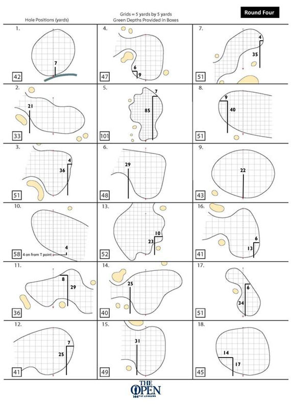• Los responsables del Royal & Ancient han decidido poner emoción a la jornada final del Open. Véanse las esquinadas posiciones de bandera, que se convertirán en todo un reto si sopla el viento por la tarde.