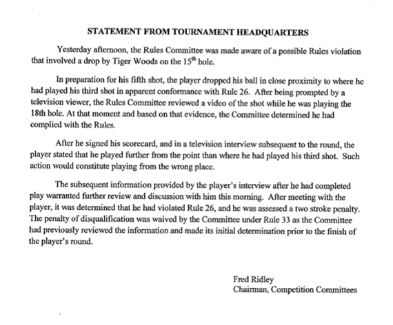 Traducción: «En el hoyo 15, realicé un dropaje como creía correcto de acuerdo a las reglas. Nadie me avisó de había violado ninguna. No sabía que había realizado un dropaje incorrecto antes de firmar mi tarjeta. Posteriormente, me reuní con el Comité del Masters el sábado por la mañana y me avisaron de que se había producido un incidente antes de terminarse mi vuelta. Su posición inicial era que no había violación alguna, pero tenía dudas basadas en mi entrevista posterior. Después de discutir la situación con ellos esta mañana, he recibido dos golpes de penalidad. Entiendo y acepto la penalidad y respeto la decisión del Comite».