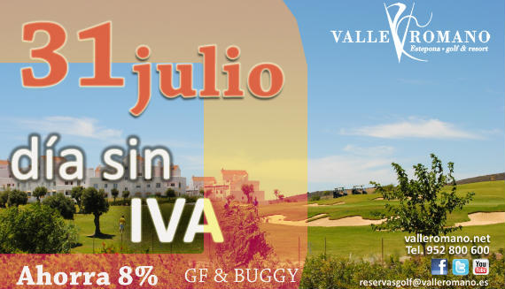 Valle Romano Golf celebra el próximo 31 de julio el Día sin IVA. Desde las 7,30 h de la mañana y hasta última hora de la tarde, el campo de Estepona ofrece sus 18 hoyos al precio especial de verano con el descuento del 8% correspondiente al IVA.