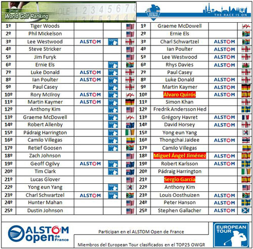 Álvaro Quirós (37º OWGR; Open de España de 2010) y Miguel Ángel Jiménez (50º OWGR; Omega Dubai Desert Classic de 2010) son nuestros jugadores mejor clasificados en el ránking mundial, pero mientras el primero busca una victoria que lo devuelva al top 25 y certifique sus opciones de Ryder Cup (el ganador se lleva 500.000 € y alrededor de 50 puntos del OWGR), el segundo necesita de una buena actuación para no perder la cota de los cincuenta primeros del mundo.