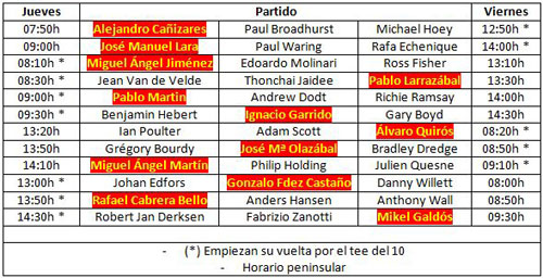 Miguel Ángel Jiménez, por su parte, comparte partido con Edoardo Molinari y Ross Fisher, el jueves a las 08:10h desde el tee del 10, y el viernes a las 13:10h desde el tee del 1.