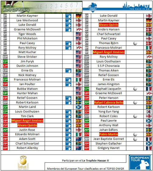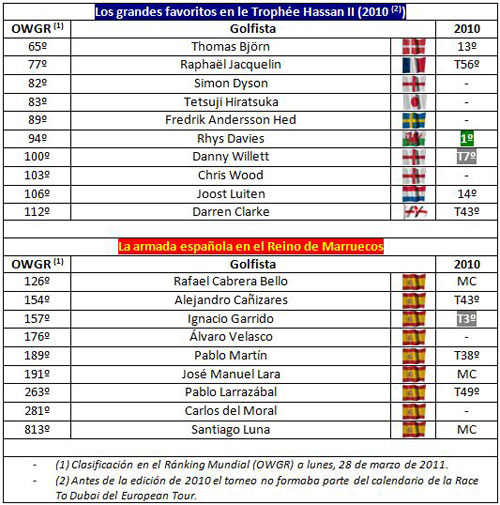 Si tomamos como principal referencia la clasificación mundial, vemos cómo hasta seis golfistas del top 100 tratarán de suceder a Rhys Davies en el palmarés del torneo marroquí: el danés Thomas Björn (13º OWGR, Commercialbank Qatar Masters de 2011), el francés Raphaël Jacquelin (77º, Sicilian Open de 2011, y cuarto la semana pasada en el Parador de Málaga Golf), los ingleses Simon Dyson (82º, Alfred Dunhill Links Championship de 2009) y Danny Willett (100º), Tetsuji Hiratsuka (83º, Black Mountain Masters del Asian Tour de 2010, y decimoctavo en el Open de Andalucía tras asomarse por los puestos de cabeza durante las dos primeras jornadas) y el sueco Fredrik Andersson Hed (89º, BMW Italian Open del 2010).
